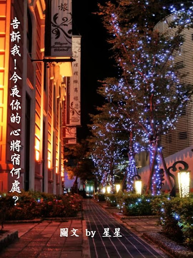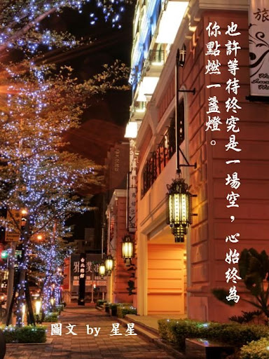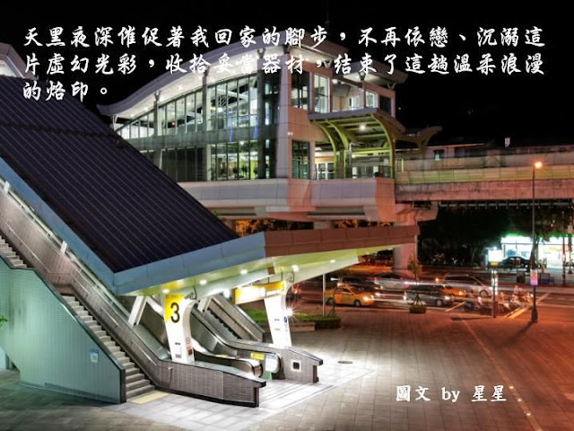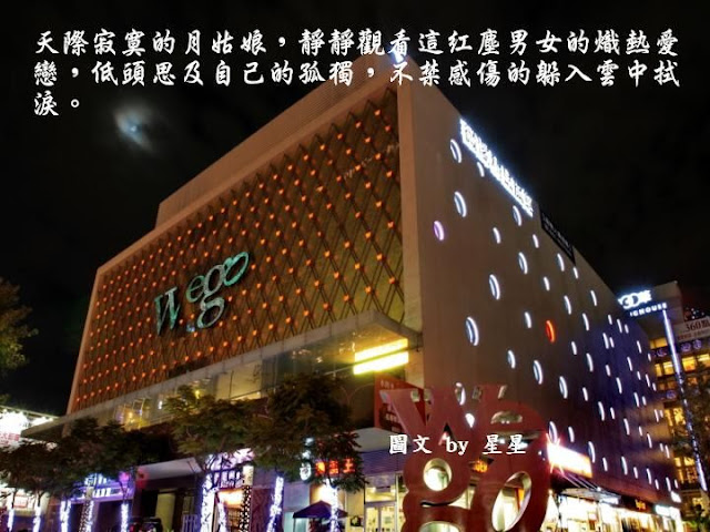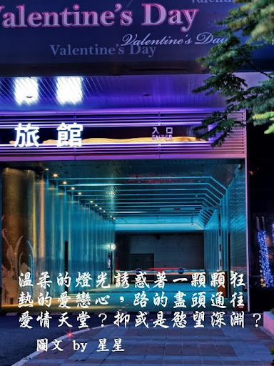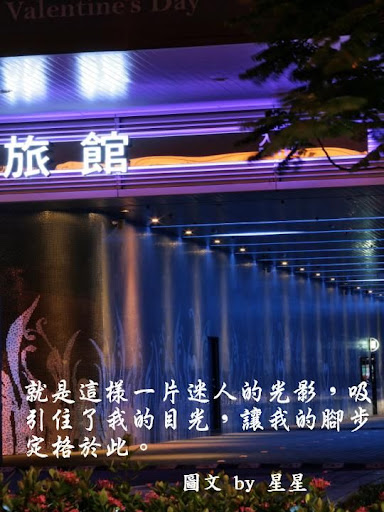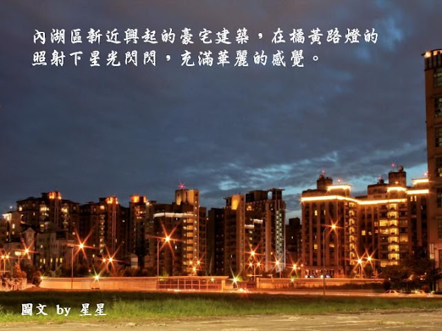 「內湖」永遠是我的家,不管她的霓虹燈如何閃爍;不論她的人心如何轉變,我永遠喜歡她的真和美。繁華紅塵一場夢;蒼茫俗世一場空,雖然這片溫柔鄉的絢爛對我有些距離、太過陌生,但坦白說那燈光的繽紛真是好迷人啊!每每開車或搭車行經這裡時,我的心似乎就被牽動著,尤其是狂野的攝影心就按耐不住的亂舞,所以好奇的我決定一探究竟,用我的鏡頭烙印這片溫柔鄉的心動精采!想當然爾的,高檔的汽車旅館車來車去、人來人往,最重視的莫過於個人隱私,自然我這歐巴桑好奇的猛拍,還是引來了一陣陣的關注,還好我看起來不像狗仔隊,所以沒有惹上莫名的麻煩,哈!「內湖溫柔夜未眠」屬於我的冒險帶些刺激的心情,當然愛作夢的我,還是搭上了我最會的愛情文字,以襯托這溫柔鄉的意境,希望你會喜歡這樣的創作!