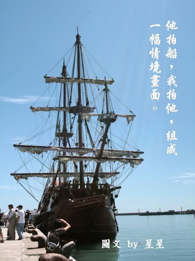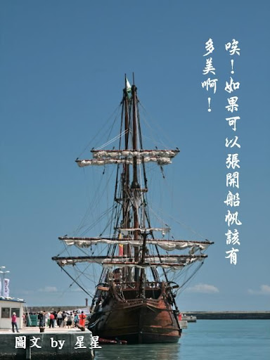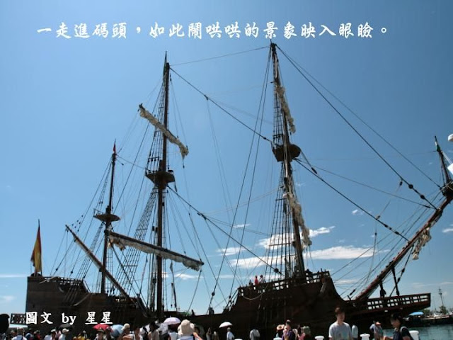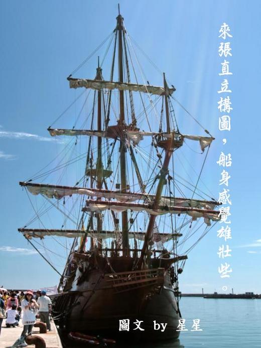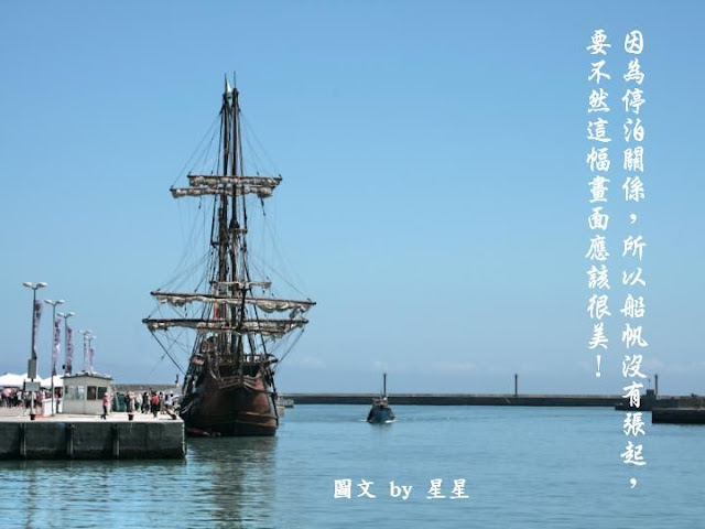 坦白說看著這艘不算大的古船,心裡是有些失望的,因為它為了停靠安全考量,所以船帆都是捲起的,而且據工作人員告知,只有在有風力的助力下,且離開港口開往外海,才有機會看見它揚帆啟航,所以我幾乎是很不認真,草草拍拍當紀錄罷了!