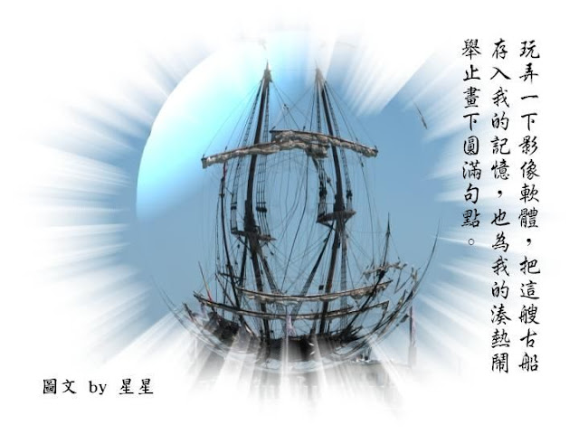 前幾天從新聞中得知了這樣的訊息:「上海世博西班牙館中的古船『安達魯西亞』號,即將在離開世博返航途中繞經宜蘭,駐留烏石港開放讓民眾登船參觀」,當下狂野的攝影心又開始激盪難安了。想像力無限遐想延伸,自我陶醉著那有如海盜船般揚帆啟航的畫面,心中忍不住讚嘆著:美!美!美,二話不說開始蒐集拍攝資訊。不料颱風來襲,原本預計停靠烏石港的規劃,擔心東部風速強勁,古船不堪襲擊臨時改往基隆港停靠,資訊不夠準確的我沒有掌控到這個訊息,只能白白看著新聞畫面扼腕了。