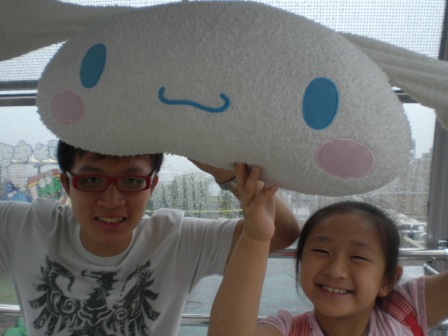 怕死懼高的老爸對摩天輪望之卻步,我們三人獨自前往,選坐透明車廂,車內的大耳狗抱枕可愛極了!宇玄愛不釋手。在摩天輪上看著灰灰的天空也是一種難得的經驗呢!我跟哥哥分享自己第一次坐飛機,發現烏雲之上就是藍天的驚喜,特別的體驗讓我至今難忘!