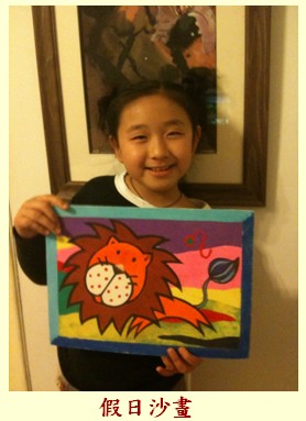 - 利用假日完成的沙畫,媽媽切割圖形,楀璿負責到色沙及塗抹均勻,玩得十分開心。