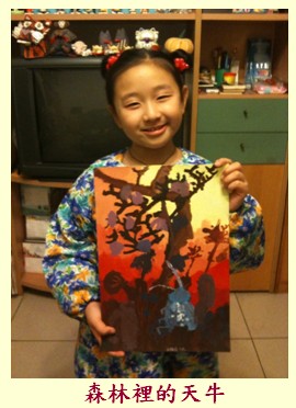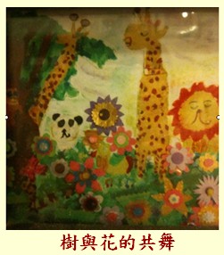 - 代表學校參加比賽 - 樹與花的共舞,用色紙剪出各種大小不同的形狀,再用泡棉膠黏成立體的花朵,草皮也是同樣的作法。動物們則是用蠟筆完成,最後剪貼在圖畫紙上。