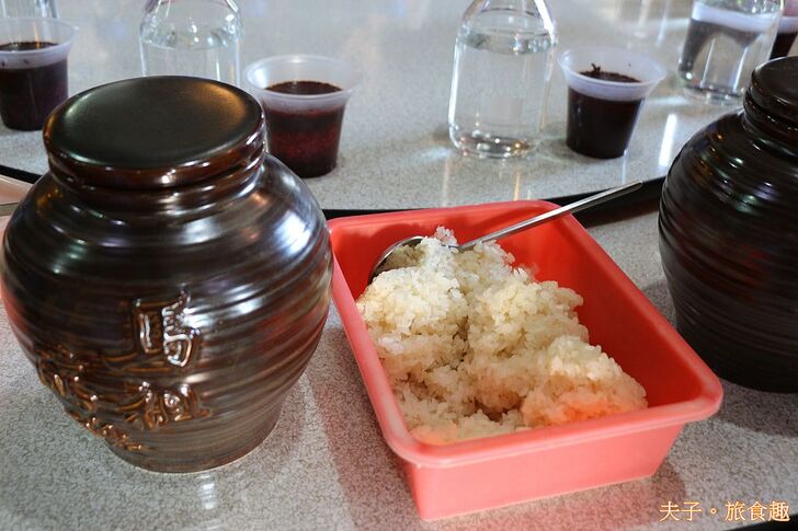 黃老板為了讓團員們了解水、紅麴與糯米混合物最終醣化結果,特別拿出釀造中的大缸,讓團員們觀察記錄,以便在家時可以確認自己的老酒是否釀造成功?筆者(夫子) 嚐一口記下口感,酸的!