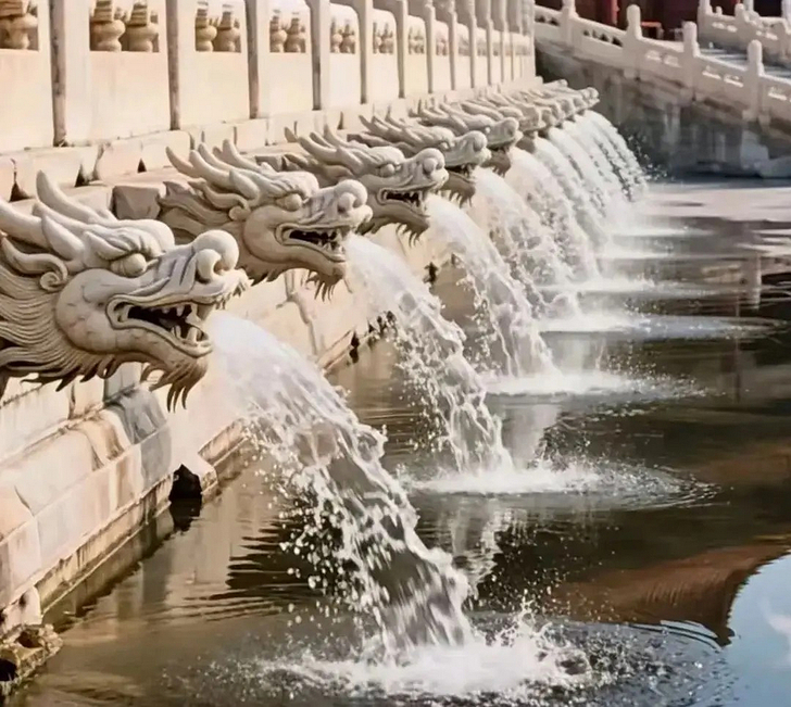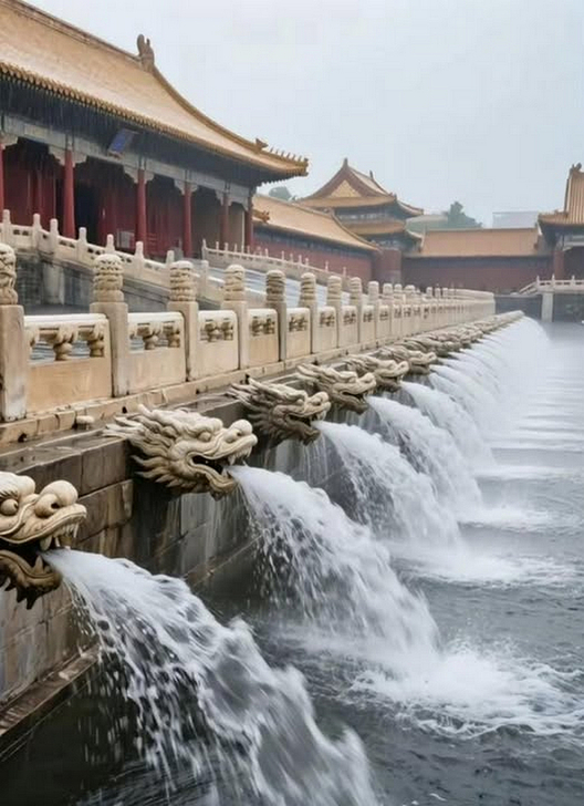 中國北京故宮「千龍吐水」AI 生成 石雕龍頭精緻生動、噴流水勢磅礡 讓人動容