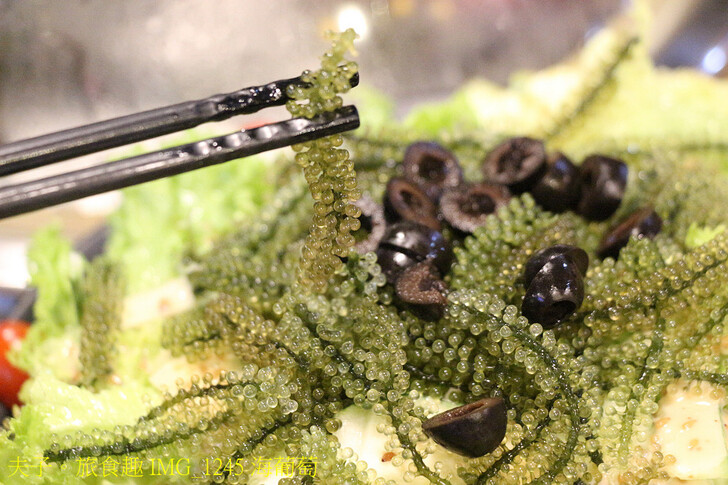 海葡萄,因長得像海中的綠葡萄而得名,是熱量低的長莖葡萄蕨藻,晶瑩剔透的綠色小顆粒,放在嘴中輕咬會逼啵逼啵的彈跳,滿滿的海味在嘴裡擴散,又被稱作植物中的魚子醬。