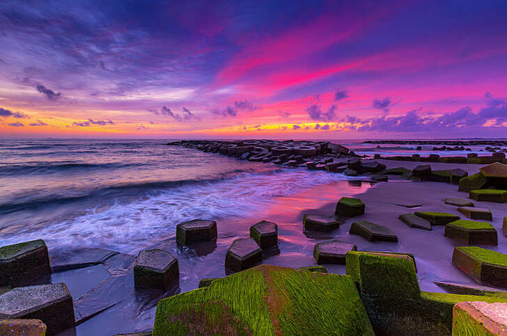 曾舉辦多次攝影展的臺南市鹽份地帶攝影藝術家王素滿老師針對銀牌得獎作品表示:「銀牌作品以臺南黃金海岸季節限定的綠藻景觀為拍攝主題,巧妙捕捉夕陽時分雲彩,增添畫面層次與豐富度,運用慢速快門拍攝手法展現海浪流動之美,手法獨特與眾不同,相當吸睛」。(照片:銀牌作品 張美珍 黃金海岸夕燒浪絲之美)
