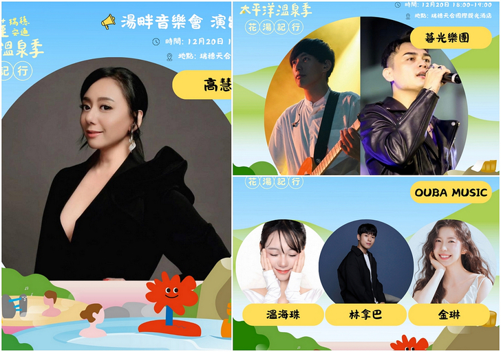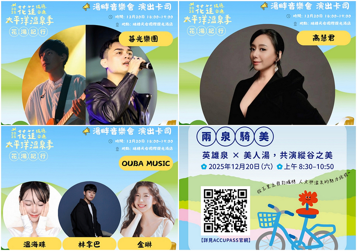 觀光處長余明勲表示,溫泉季活動最後一周的「花湯市集音樂會」,將於12月20日晚間6點在瑞穗天合國際觀光酒店廣場熱鬧登場,邀請療癒系金曲歌后高慧君、實力派樂團暮光演出,現場更將特別安排近期在台灣引發高度討論的韓國人氣團體 OUBA MUSIC 首度參與太平洋溫泉季,以充滿感染力的舞台魅力,為花蓮冬夜帶來最國際化、最熱鬧的壓軸演出。