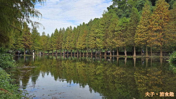 池畔落羽松美麗換裝,嫣紅映襯藍天白雲,幻畫絢麗多彩的湖光水色,落羽松倒影有著絕美畫面,妝點水塘無限美麗的驚豔,有「落羽映照,湖光倒影浸山青」的美景。