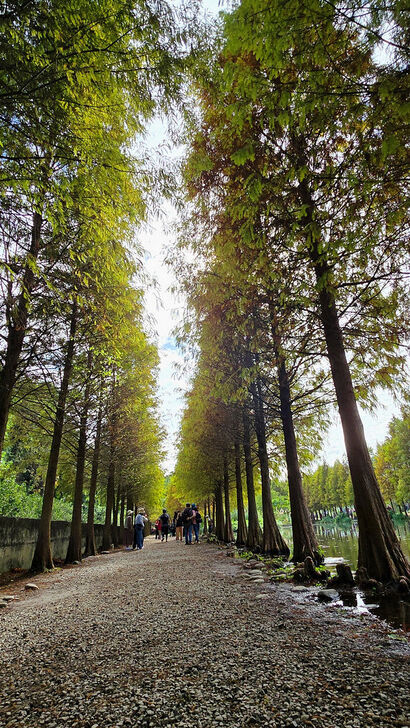 冬至後北風起,桃園大溪「月眉人工濕地生態公園」池畔落羽松美麗換裝,嫣紅映襯藍天白雲,幻畫絢麗多彩的湖光水色,落羽松倒影有著絕美畫面,妝點水塘無限美麗的驚豔,有「落羽映照,湖光倒影浸山青」的美景。