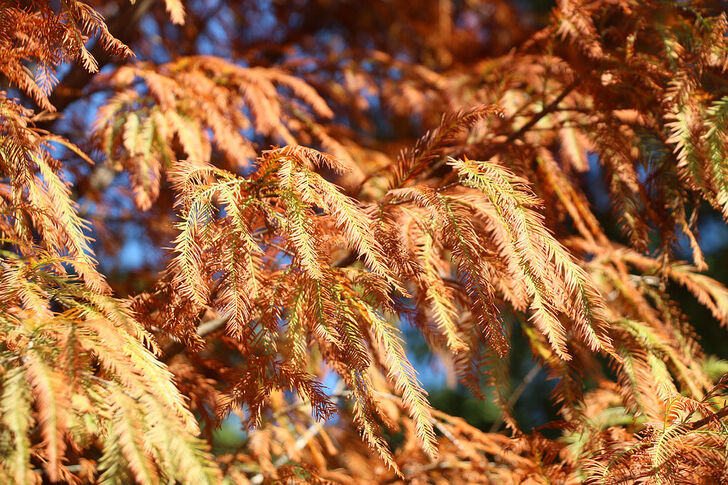 落羽松,小羽葉,葉互生,小羽葉上的線形葉,為 2 列羽狀,冬季落葉前變成紅褐色。