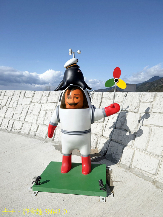 港灣展區作品名稱:體操男爵船長與美獸的返航歡迎,藝術家張育嘉曾在海巡署服役,對港口十分熟悉。他以代表角色體操男爵與美獸象徵迎接返航的導航員,並帶有燈塔指引的意涵。他也在男爵手上加入旋轉發亮的風車,讓作品具有明顯的指引效果。