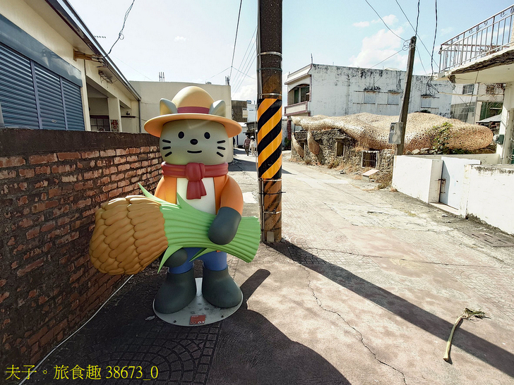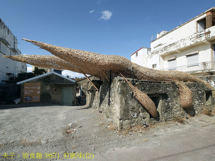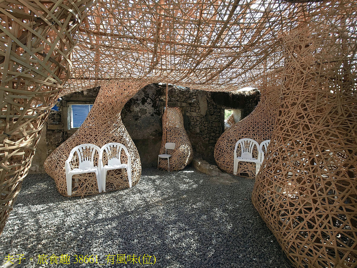 藝術家游文富,以風吹拂經過破舊石頭屋的流體造型,形塑落山風的視覺感,也形成殘缺破舊的石頭屋可供遮蔽滯留的奇特空間,屋內以竹編及塑膠椅編組成「有風的座位」,是風的味 (位) 道!