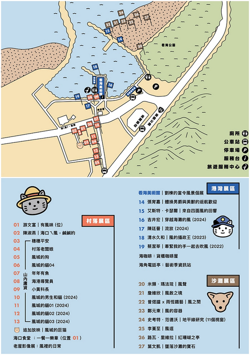 2025落山風藝術季三大展區,以「風、旬、海」為軸線,串連海口村、看海美術館 (含港灣) 與沙灘三處地景,讓觀者在步行與移動的過程中,循序感受地方的節奏、季節的韻律與海口獨有的生活故事。