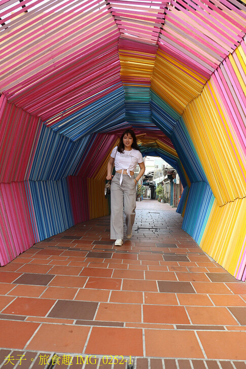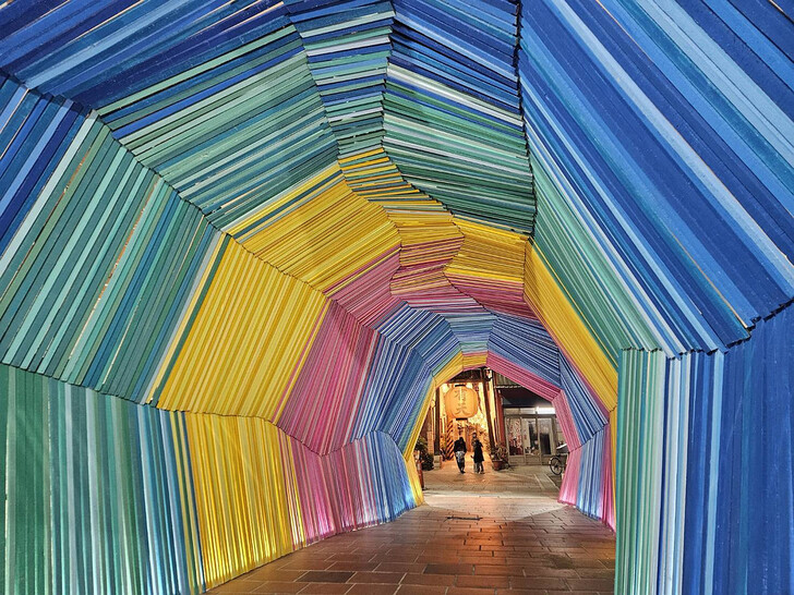 「記憶的流動」藝術裝置,藝術家王振偉設定於鹽水老街的連成巷,以老宅屋頂常見的瓦壓條彩繪為主要元素,創造出色彩繽紛、有如時光隧道的空間。