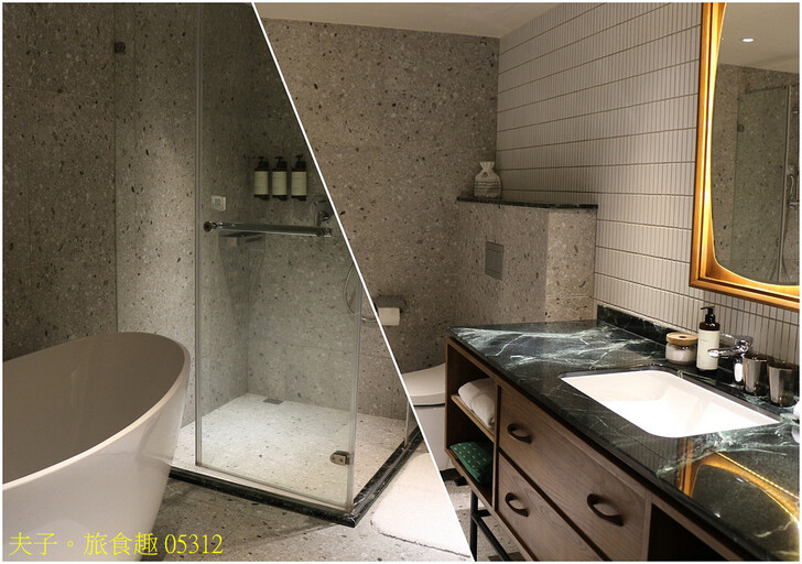 浴室採乾濕分離,一座大型洗手台與免治馬桶相連,一側淋浴間與大型浴缸分開設置。