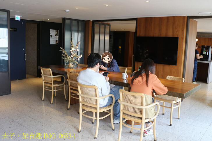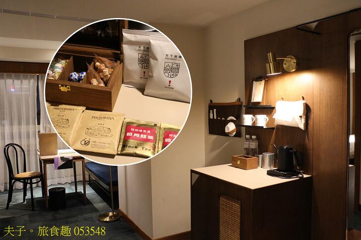房間配置大型液晶電視、吹風機、熱水壺、冰箱、休憩桌椅,並提供拋棄式布拖鞋、茶包、濾掛式咖啡包、瓶裝水與復古迎賓小甜食,供入住客人自行取用,也有免費 Wi-Fi 可使用,最特別的是房間牆上還掛著整套免洗餐具,外購餐點回房如果額外需要碗、盤與筷子,天下南隅都幫你準備好了。