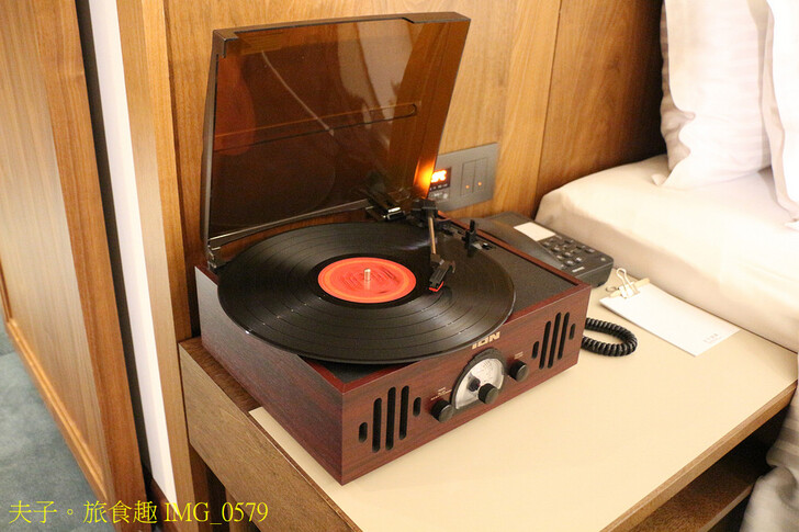 房間特別設置黑膠唱機能聽黑膠唱片 (可至一樓櫃台旁的休憩室挑選黑膠唱片,登記後即可借聽),超特別的體驗!千禧年 (2000) 後出生的朋友,應該沒用過黑膠唱片聽音樂吧!