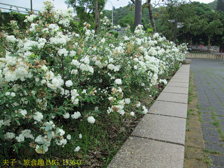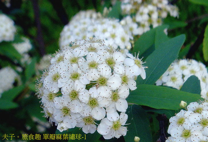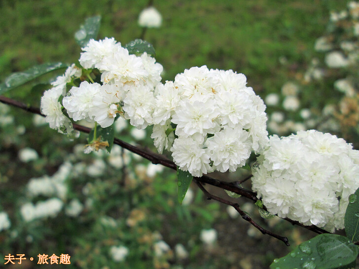 清明過後初夏登場,陣陣暖風中公園整排的重瓣麻葉繡球 (又稱麻葉繡線菊) 開始盛開,密集的白色小花團聚成球,佈滿在纖細的枝條上。