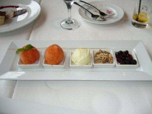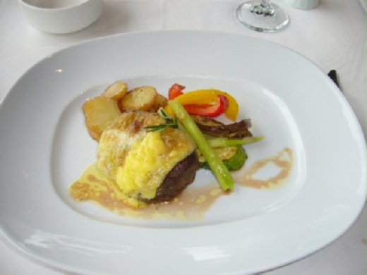 主菜我選了腓力牛排佐奶油醬汁,五分熟的肉汁汨汨流出,配上風味清淡而不油膩的奶油汁,襯出牛肉本身的香甜,還不賴。Gary說他的海鮮義大利麵蕃茄醬汁是現炒的,口感很新鮮。老婆的橙汁鴉胸甜中帶酸,也是適合初夏的口感。