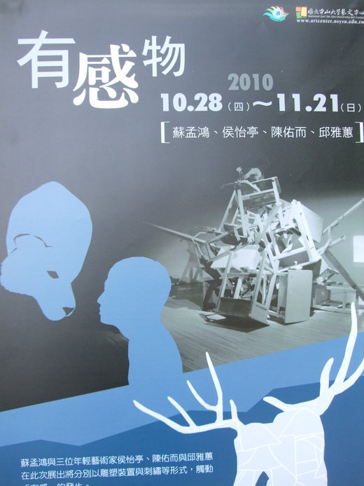 昨日(10/28)下午兩點三十分,於中山大學蔣公行館西灣藝廊,「有感物」藝術展宣告正式開幕。開幕典禮由校長楊弘敦親臨致詞,隨後,藝文中心黃心雅主任也上台勉勵在場同學,最後,在眾所期盼下,四位藝術家(蘇孟鴻、侯怡亭、陳佑而、邱雅蕙)向在場學生一一解說創作動機及隱藏在作品身後的理念。