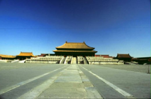 廣場的正中央是一條自南向北縱貫紫禁城的石板大道,這條石板道不僅僅縱貫紫禁城,南北還可再延伸,南可至外城的平安門,北可展延到鐘鼓樓,全長達8公里,一路構成北京城的中軸線。
