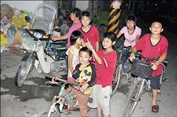 二崙的超級阿嬤廖秀英(左後方牽機車者)靠拾荒扶養七個孫子女(有一個未入鏡),孩子們在假日時也騎著腳踏車陪阿嬤上工。(記者李靜芳攝)