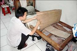 雖是疲累的一天,但家裡房間讓給母、姊,他得睡在客廳,破床架上橫放四根木條、上覆破草蓆,床架一塌再塌,有時一翻身手腳還會卡進縫隙動彈不得。如此一睡四年,他說:「是不舒服,但沒錢換,這樣就很好了。」