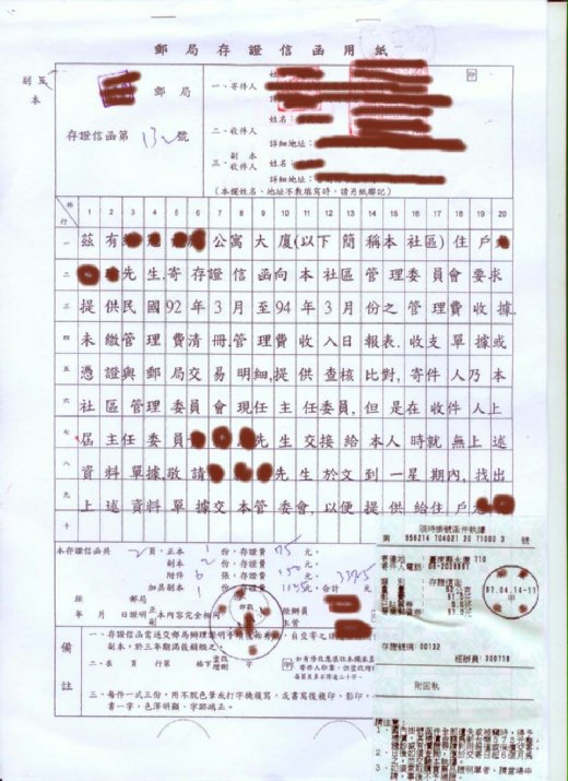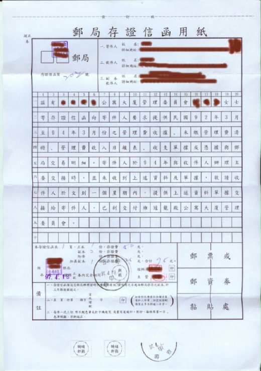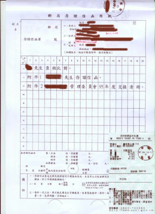 6 我寫了交接會議同意書放管理室給新舊委員3天內簽名,今天是第3天了,差不多都簽名了,昨天下午B女士就當面要求我在3天內交接,還要我去找里長來做監交人,想也知道今晚她還會用盡各種方法來逼迫我。