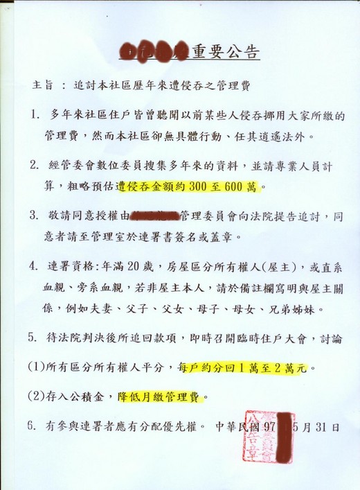 1. 多年來社區住戶皆曾聽聞以前某些人侵吞挪用大家所繳的管理費,然而本社區卻無具體行動、任其逍遙法外。