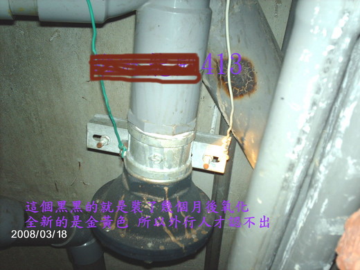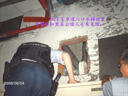 今天清早水管爆破,發現到當初還裝在牆內的第4個了,S工程師(當時的工程委員)通知我,我馬上帶著照相機拍照存證,在還未請廠商來維修之前,先要保持原狀,我又通知管區警察和里長見證牆壁內確實有裝水鎚。