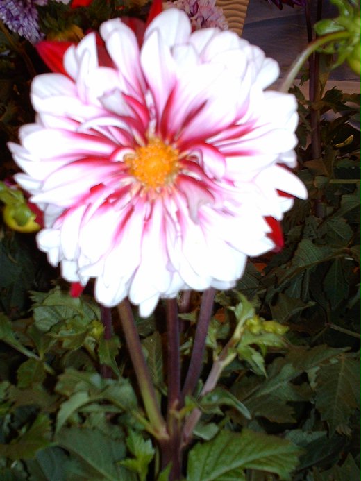 上圖照片攝於大安森林公園,很大朵的大理花,外層是鮮豔的大紅色,中間層是白色,靠近黃色花蕊又是深粉紅色,層層疊疊的花瓣,不禁想起金庸小說那個段譽和大理花的故事。