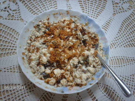 先把皮蛋和豆腐用大湯匙攪碎,加上淡味醬油一大湯匙攪拌,最後撒上肉鬆和柴魚片,如果有蔥花那就十全十美了。吃的時候再把整盤通通拌勻,美味滿點。