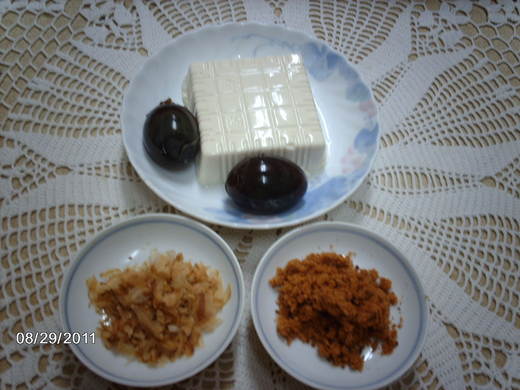 盒裝豆腐一盒、皮蛋2顆、肉鬆(魚鬆)一大湯匙、柴魚片一大湯匙。