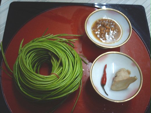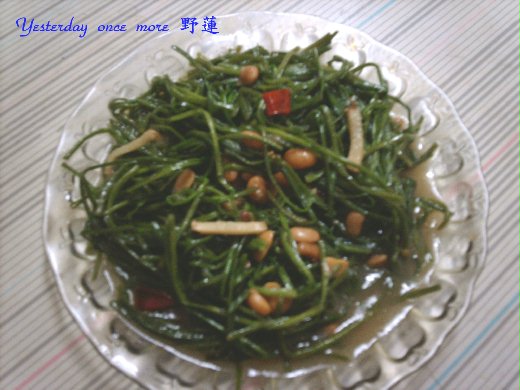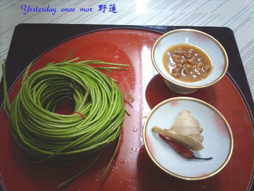 作法 : 少許油熱鍋,先下薑絲、辣椒爆香,續入野蓮、米醬,大火快炒幾下,頂多一分鐘,野蓮變軟馬上起鍋,清爽可口。