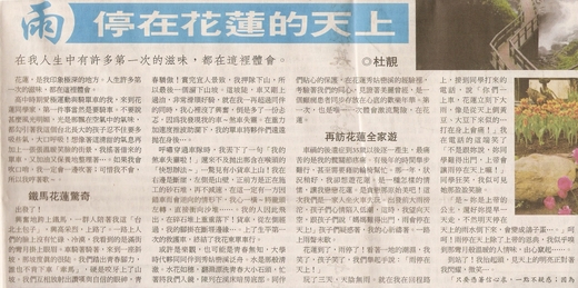玩了三天,天陰無雨。就在我在回程路上,接到同學打來的電話,說「你們一上車,花蓮立刻下大雨,像是從天上倒黃豆、大豆下來似的…打在身上會痛!」我在電話的這端笑了「不是跟妳說,妳同學難得出門,上帝會讓雨停在天上嘛!」同學狂笑,我似可見她那盈盈笑臉。