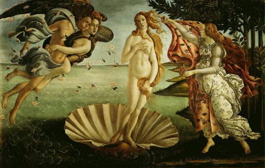 原著,是法文,電影癡看不懂也讀不來,從台詞裡,聽到韻腳、看到詩歌演出的形式,從語言到影像,表演方式,很像把戲劇帶到了第五世紀田園風情,攝成影像。但又好似不只於此。侯麥的《愛情誓言》活脫脫像把文藝復興時期波提且利(Sandro Botticelli,1445 ~ 1510)的畫作,透過表演和影像活了出來(特別是把救起賽拉東的三美人,活像從〈三美圖〉裡走出來的古典美女,還衣衫飄揚的模樣,都那麼像波提且利筆下飛揚的飄逸),看那個故事,彷彿走進一個另個希臘神話故事的魔幻裡。可侯麥不是一向寫實嗎?為何《愛情誓言》處處充斥著神話感?