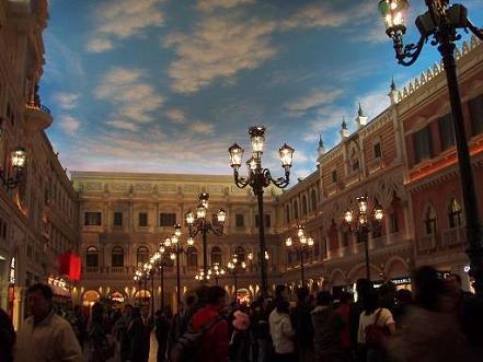 在澳門不能不光顧的地方當然是賭城囉!除了住宿的酒店【新世紀酒店】有賭場外,還安排參訪了【賭城威尼斯人度假城】,這是一個仿義大利水都威尼斯建造的度假中心,二樓購物中心沿著運河而建,遊客可花120港幣坐在船上,順流而下,船夫亦會唱歌娛樂遊客。抬頭一望看到了天空、白雲,哈!那都是假的啦,不過還做得真像,假如那些雲朵會飄,那就更仿如置身在水都了。