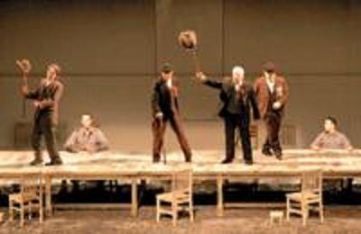 《安蒂岡妮》沒有華麗花俏的舞台,呈現在觀眾面前的是一張橫跨且占滿舞台的大長桌子,桌子旁擺放了幾張像中小學課堂上那種樣子的椅子,至於桌椅的顏子是屬於灰色系囉!而後面的背景呢?只是一片大大的白色牆壁,但是這片牆卻另有玄機,中間的一片小門會緩緩落下跨置在長桌上,而演員因應劇情的需要從這道門出來,再直接站在桌子上表演囉!看似簡單的舞台設計,卻處處有巧妙之處,還真好玩。