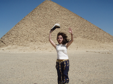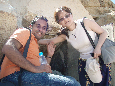 當你站在雄偉的金字塔前,最想做的是什麼呢?擁抱金字塔嗎?當然不可能,那還能做什麼呢?導遊很可愛的安排我們在金字塔前做一件很可愛的事--拍照。這幾天已經拍了不少金字塔的照片,再拍照有何可愛可言呢?哈!導遊竟要我們在金字塔前「跳躍」,再拍下這背景有金字塔「跳躍」的照片。用了運動模式,竟忘了用連拍模式,請導遊幫忙ㄚ今拍下這可愛的照片,拍了四、五張,慶幸的是還有一張是成功的。不過,這時真恨不得自己有一台功能強大的相機,這台有三、四年歷史的數位相機,也許該退休了。