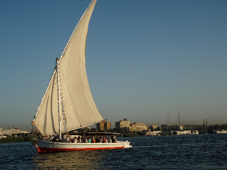 睡過了午覺,4:30在郵輪的大廳集合,本以為還要搭車到哪個碼頭搭帆船遊尼羅河,沒想到搭帆船處竟在停泊郵輪的旁邊而已。哈!不怕死、很勇敢的我們,依然沒穿救生衣。