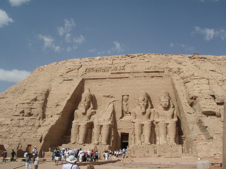 約10分鐘的車程就到了拉美西斯二世神殿的停車場,走了一小段路後,看到了壯觀的神殿。遠遠瞧來並不覺得了不起,但一接近神殿時,頭一往上抬時,心裡就「哇」的一聲,雖然沒有金字塔般的高聳入雲,但我們簡直就像格列佛童話故事裡的小小人,雕像就是巨人格列佛。
