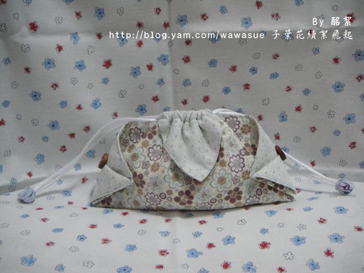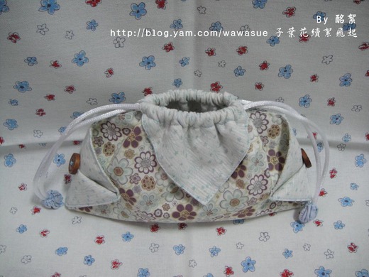 我選了淺藍色花布用做YOYO的方法把拉繩的接頭部份包起來。束口袋二側縫上木釦做裝飾。