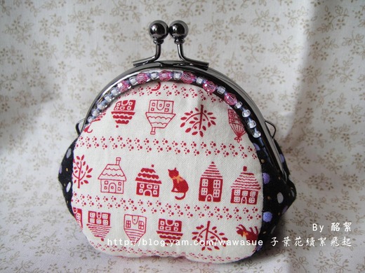 這紅色布一直讓我有聖誕節的感覺,想做點變化,決定在口金上縫上bling的珠珠。