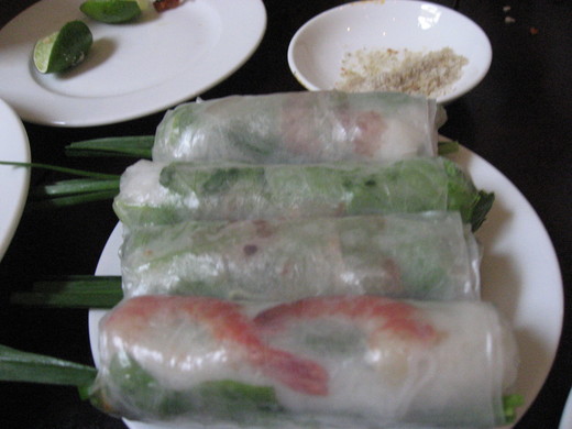 我還得留空間吃越南米粉,所以趕緊停箸,這間餐廳的米粉果然不一樣,(粗粗的越南米粉與台灣的細米粉也不同)內容料好多,除了附贈的一大盤青菜豆芽菜,大碗裡有軟綿綿的鴨血、一大推各式丸子、雞肉及油豆腐,湯頭味道也較濃烈,滿足的吃完這麼一碗米粉,接下來包覆的多麼精緻誘人的春捲送上來時,只能望著雪白粉皮裡剔紅的蝦肉興嘆!