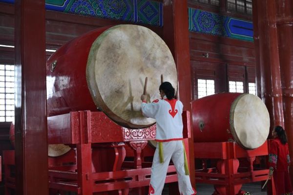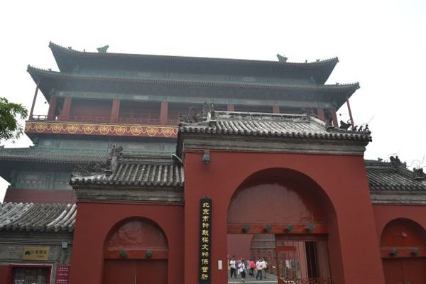 抵達鐘樓時,售票的大姊告訴我們,剛好鼓樓的表演時間快到了,請我們先去鼓樓參觀再過來。鐘樓在北,鼓樓在南,兩棟樓彼此對望,行程上是一起參觀的。過去北京的中軸線止於北邊的鐘樓,但自從奧運之後,這條中軸龍脈則往北延伸至奧運公園。