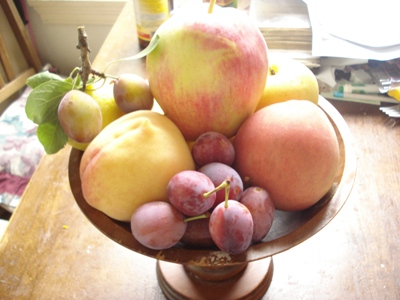 餐桌上擺著自家產的水果﹐有蘋果﹐李子(蜜棗李)﹐還有桃子。