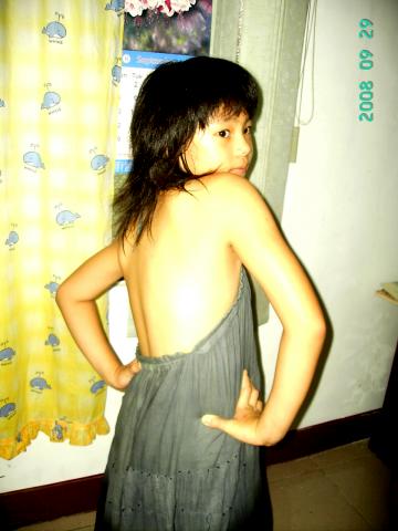 下面這張照片是她老愛偷穿我的長裙當成露背禮服.![]()