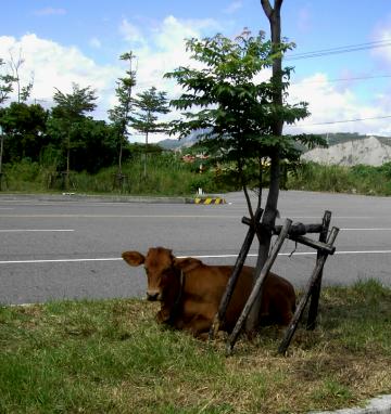 牛躺在馬路旁的樹下納涼~好悠閒
