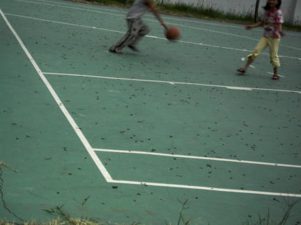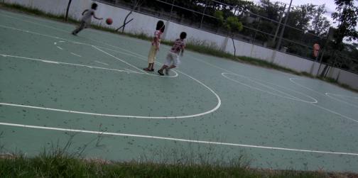 不過在籃球場上打球的小朋友們似乎是不以為意,因為他們視而不見的球照打。