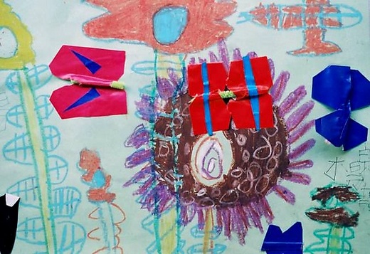 2.先畫幾朵大花〈比自己手掌大〉之後再加些葉子.....草.....毛蟲.....等都可以,用粉蠟筆畫。